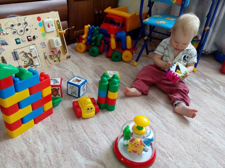 У нас популярностью пользуется машинка-каталка. Ездит на ней по квартире. Сортеры очень любит. У нас не один. С ключиками, разными кнопочками, рычажками. И ещё любит катать машинки, у нас их тоже несколько. Можно ещё купить мозаику, большую, у нас ей играет, но вместе со мной.