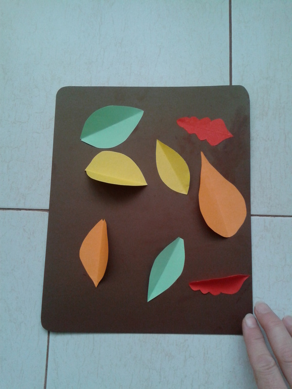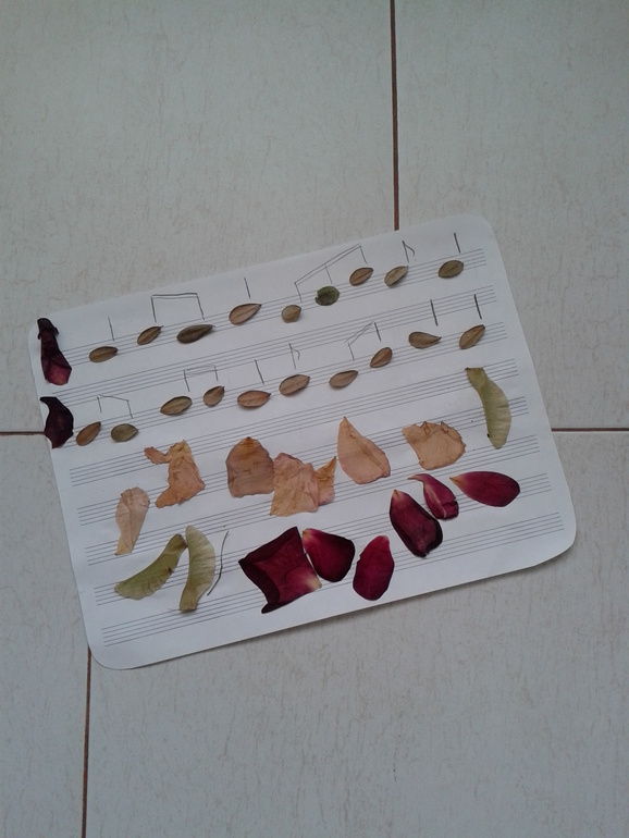 Для ноток я мазала бумагу клеем, дочка наклеивала брусничные листочки, а лепестки это уже свободное творчество дочки. Вот такой получился мотив.