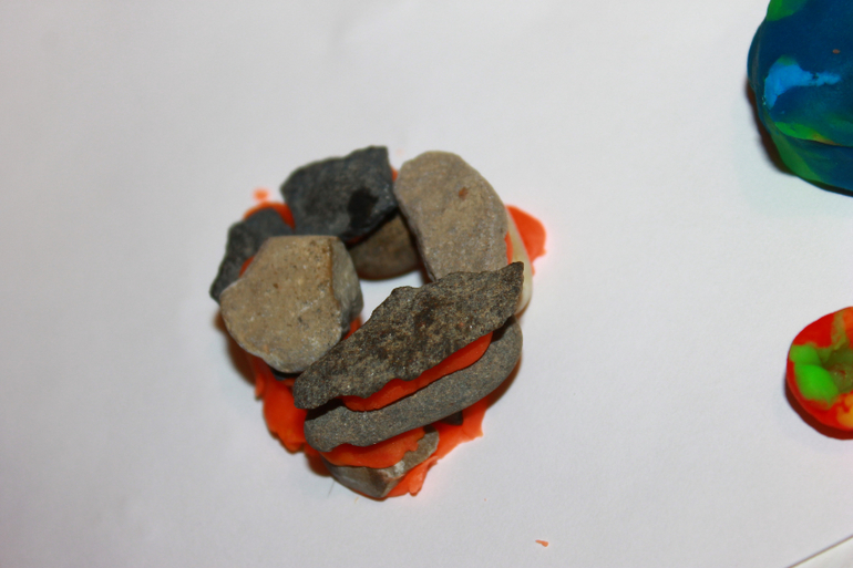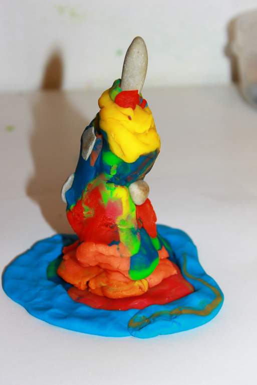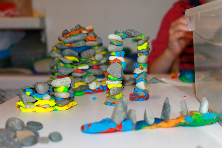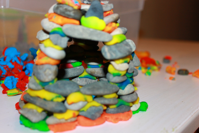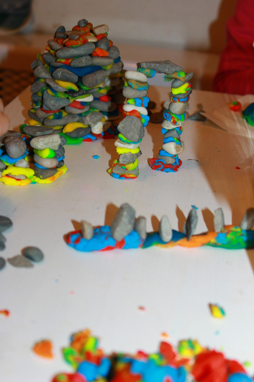 Затем начали строить башни и очень сокрушались,что они падают. Но вот на что уж и детский мозг- у нас остался огромный комок мягкого пластилина, который был уже перелеплен вдоль и поперек и вот тут-то он и пошел в ход, строились колодцы, домик, какие-то каменные арки, маяк,горные хребты и т.п. штуки