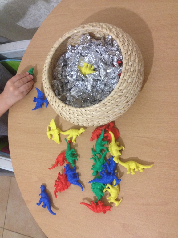 Игры и игрушки для детей от 2х-до 3-х летУ меня очень много остается фольги от игр с заворачиванием всяких мелочей в фольгу, писала уже ранее о них в других темах, сегодня же решили применить эти "отходы" в деле, розыскивали наших динозавров в серебряной листве мезозойской эры;-))) Потом взяли на помощь щипчики, сын все же стал проявлять интерес к щипчикам, но чаще пока все делает ручками.