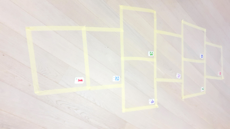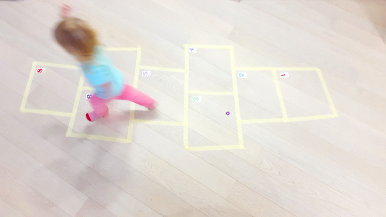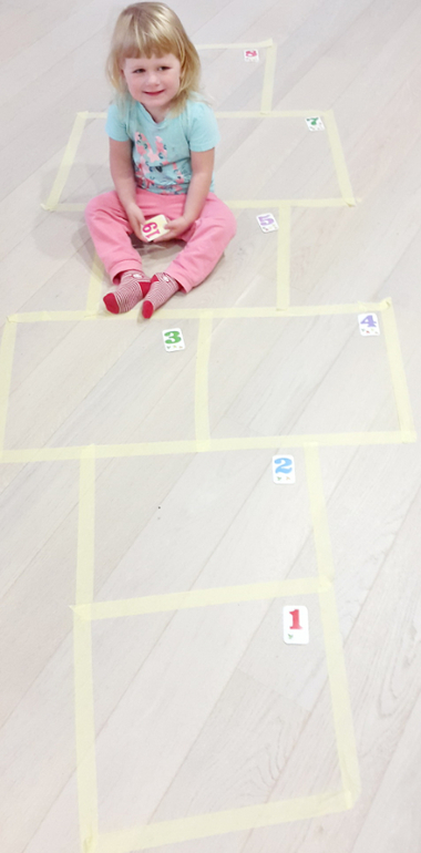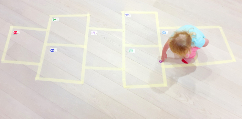 Игры и игрушки от 0 до 99 (Про игры и игрушки которые подойдут и большим и маленьким)Как-то на улице Маша увидела, как взрослые дети играют в классики. Она попросила играть с ними и это ей очень понравилось, хотя прыгать строго по клеткам ей пока трудно! И вот мы болеем, и уже плавно начинаем качаться на люстре от сидения дома, и я предлагаю ей играть в классики. Бумажным скотчем мы начертили на полу фигуру, разложили бумажные карточки с цифрами, взяли резинку для волос и стали кидать. Я еле успела ее сфотографировать, тк она мчалась галопом и радости не было предела! Долго эти классики были у нас на полу, пока не пришлось устроить помывку пола! Игра, которую можно повторять вновь и вновь!
