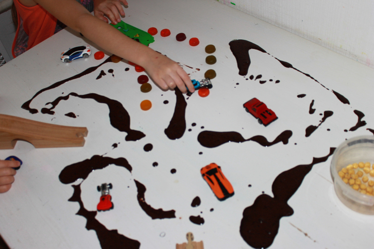 Чего тут только не было, новые ощущения- вкусовые, тактильные,а запаааах, мммм! Оттачивались умения координировать свои действия, объезжать машинкой препятствия, роль которых выполняли мармеладки, дети управляли машинами двумя руками. Это не просто левой машину вести по одному маршруту, а правой по-другому. Колесами рисовались различные узоры, пальчиками рисовали трассы, лабиринты.