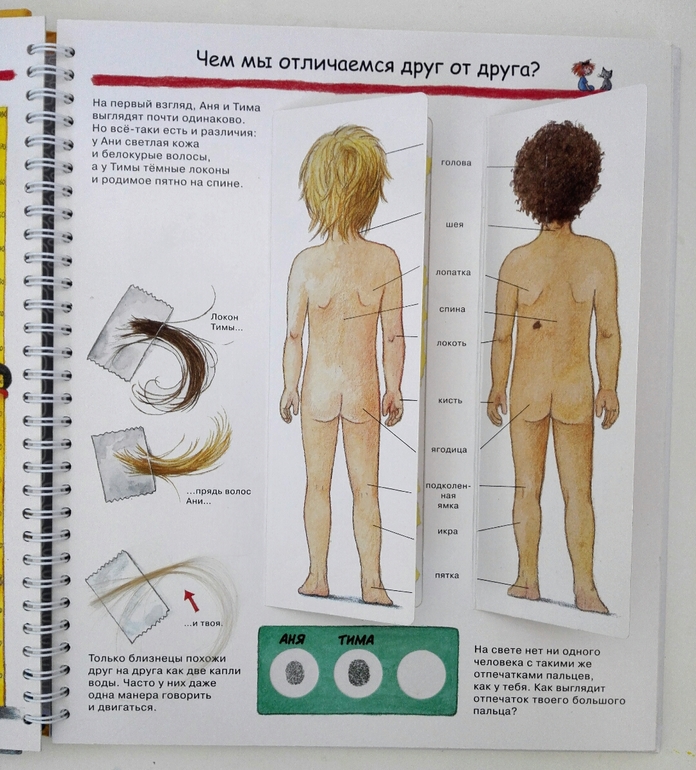 Далее разворот как растет ребенок, и чем отличаются детки, цвет волос, отпечаток пальца и есть место для собственного отпечатка пальца и локона волос.