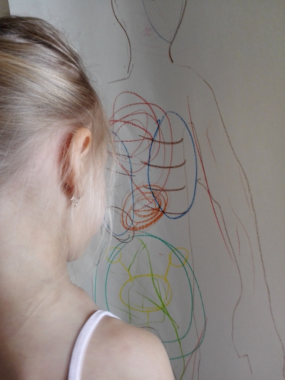 Конечно творческая часть))) Обвела на бумаге контуры своих малышек и стали рисовать органы))) Оооо ,счастью нет предела)))