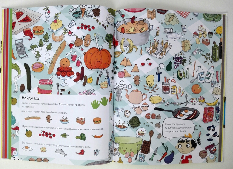 Прекрасный разворот игра "найди и покажи". Так же рассказано о свойствах продуктов, какие дают силы для физической активности, умственной и роста.