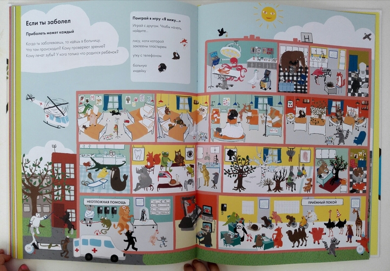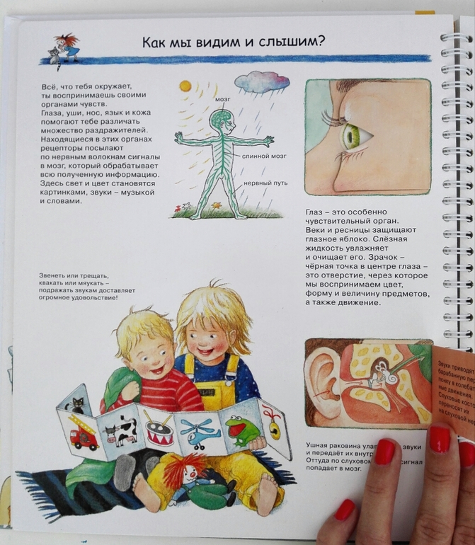 Очень интересные развороты с органами чувств, показан как устроен глаз и ухо, а так же кожа и есть игровые моменты, на ощупь определить животных)))