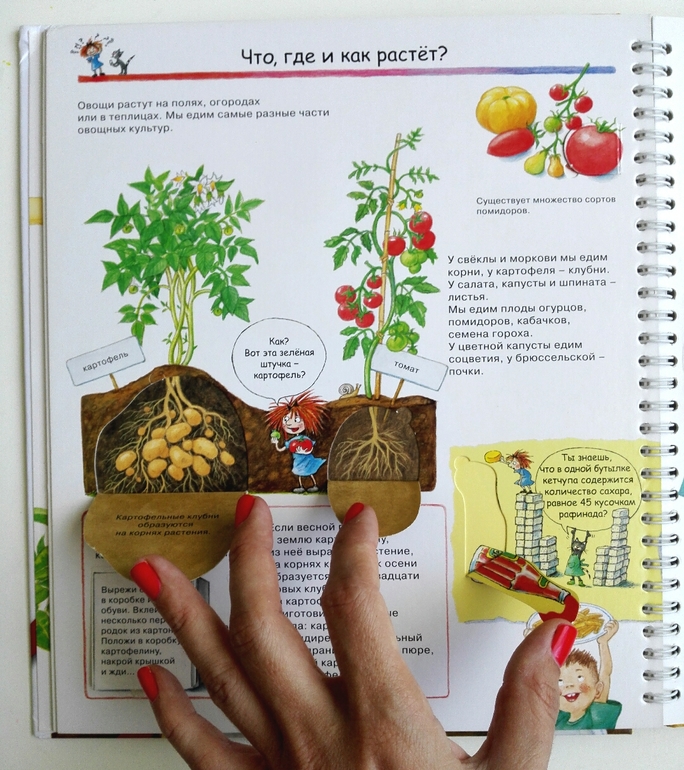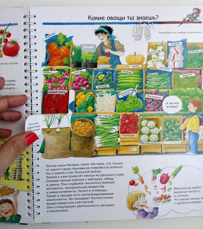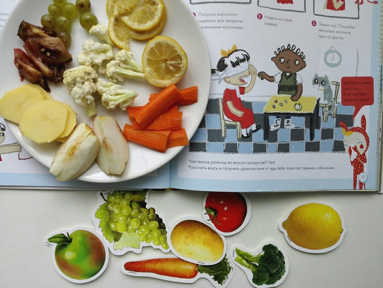 К примеру на этом развороте ребенку надо рассказать, что можно увидеть, услышать, понюхать и потрогать и вкус чего почувствовать.