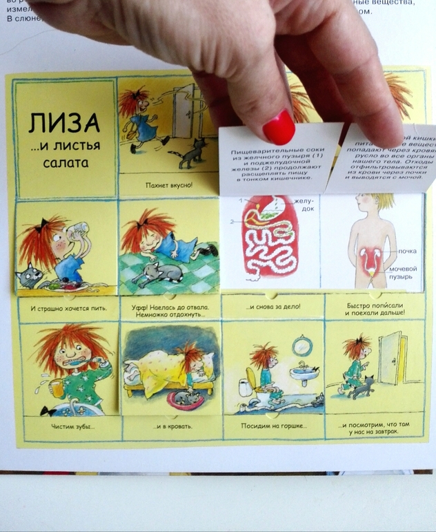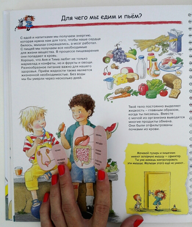 Разворот про пищеварительный тракт и почки , а самое главное - про какашки и мочу, самые заманчивые для моей крошки, это мы обсуждали на протяжении всего года. Выходя на улицу, дочка кричала: "мамочка, а эта тетя тоже какет? И дядя какает? и собачка какает? А это чья какашка?"