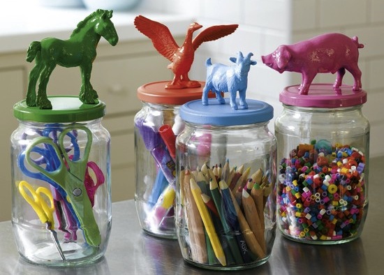 у нас пластиковые прозрачные контейнеры для недлинных карандашей, которые в карандашнице уже не видно. Мозаика и прочие мелкие конструкторы хранятся в коробках картонных подходящего размера. да много еще всего.