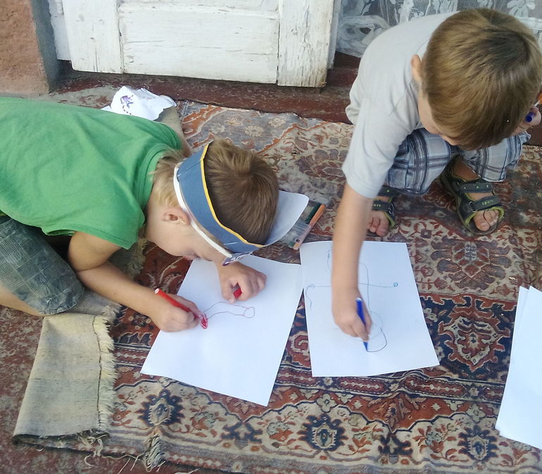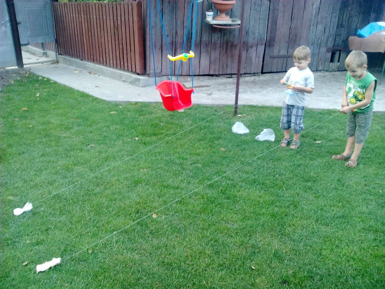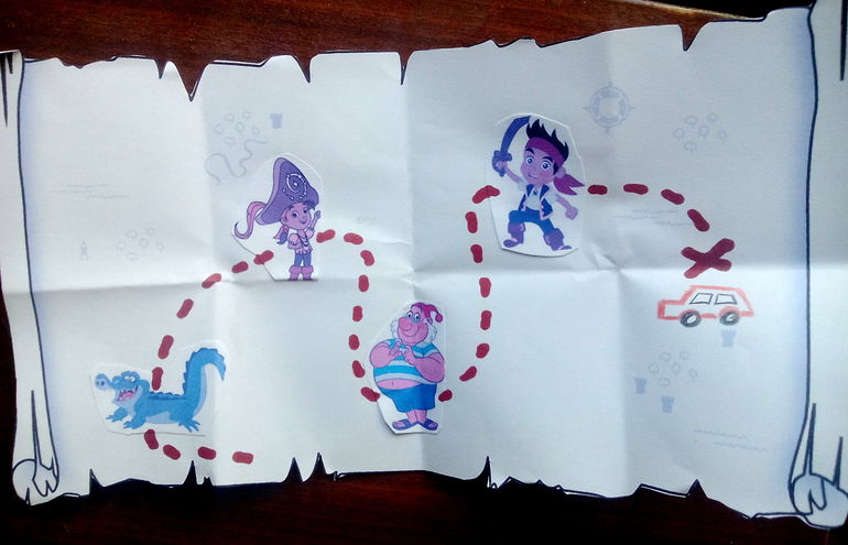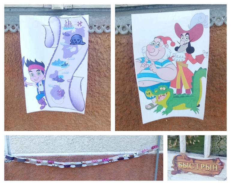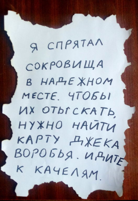 Бегом к качелям, а там следующая записка о том, где искать дальше. Тут пригодились и картинки, развешанные по двору. Например: "Джейк с картой" Дети бегут к изображению Джейка.