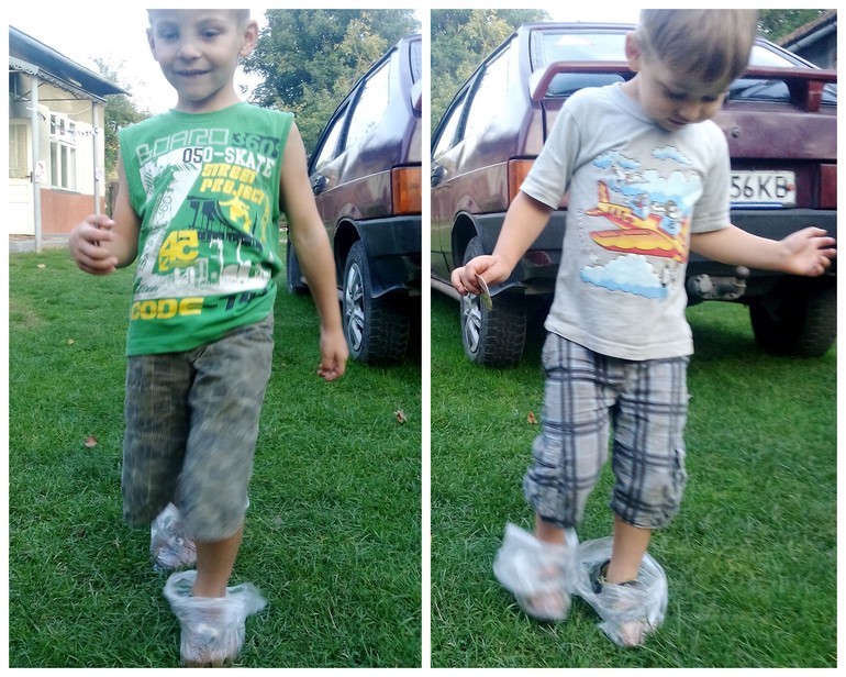 С помощью двух пакетов на ногах переправляемся через "болото".