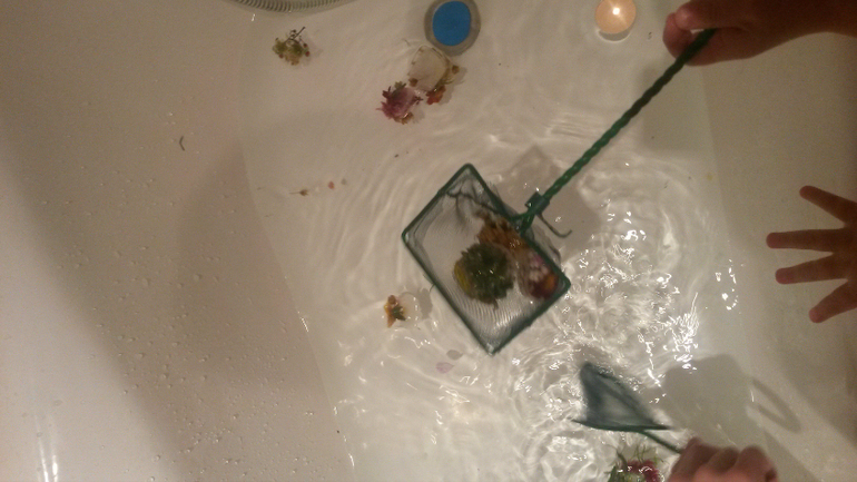 Когда у нас получились льдинки, мы сперва ими полюбовались, а потом решили покидать их в ванну. Такие мини- цвето- айсберги. Запустили несколько зажженных плавающих свечек, выключили свет и снова полюбовались со словами: " Ах, волшебство!"