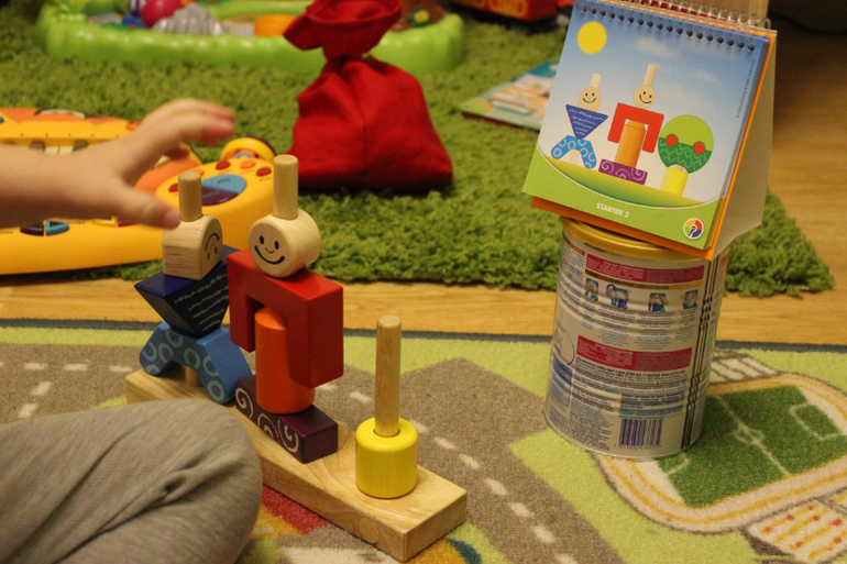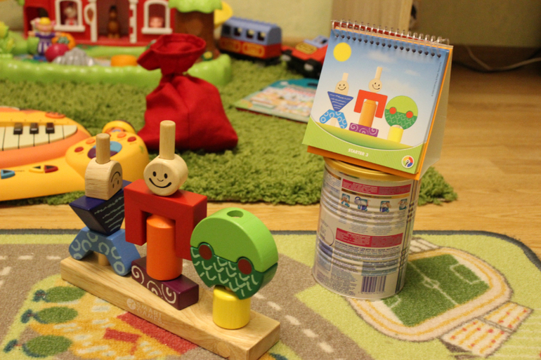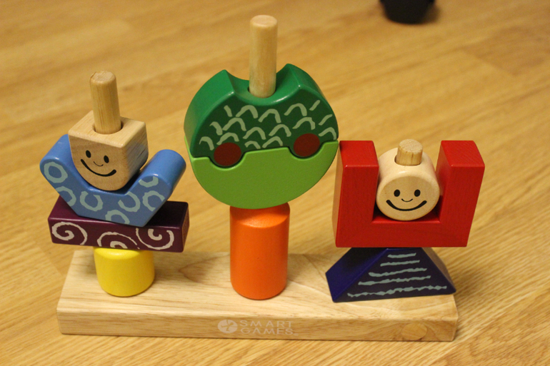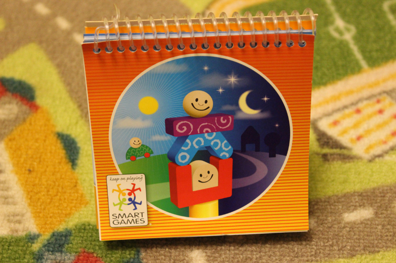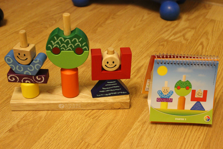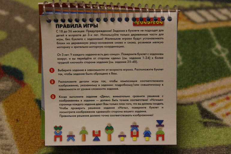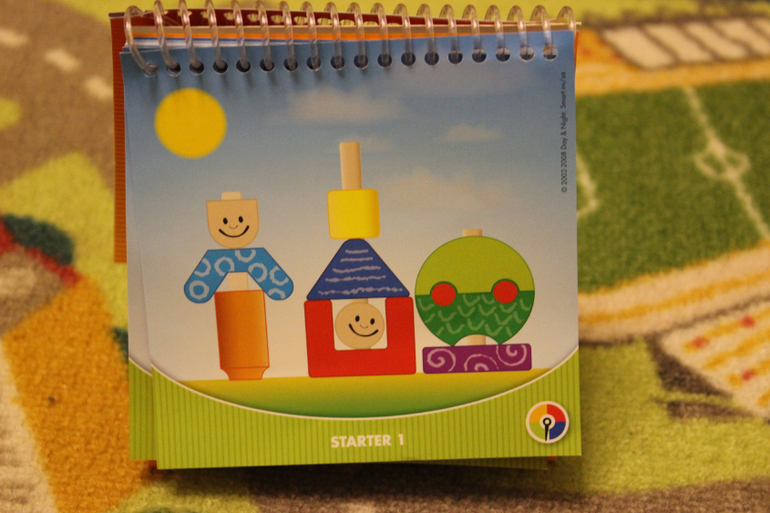 Итак, в комплекте - основа с тремя "столбиками", 10 деталей, книжечка с 48 заданиями, поделенных на 4 уровня сложности.