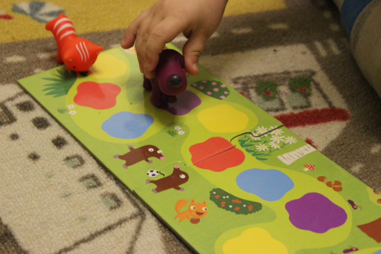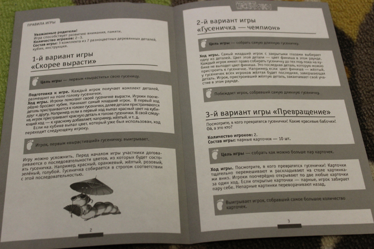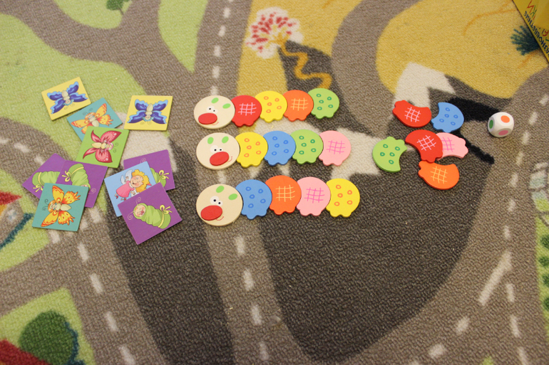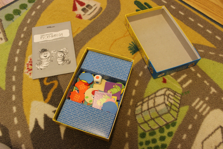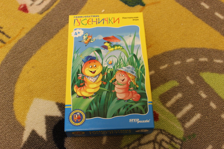 Сразу скажу, что возраст на коробке сильно завышен. 2-х летний карапуз вполне может начать играть в эту игру, пусть даже не в команде. Это отличный тренажер для запоминания цветов. Костя играет в нее один, просто составляет гусеничку по цветам, которые выпали на кубике. И получает от этого процесса огромное удовольствие. После того, как он закончит, мы вместе его пальчиком считаем все детали и складываем их в коробку, либо начинаем собирать гусеницу снова. Поэтому карточки мы пока не используем.