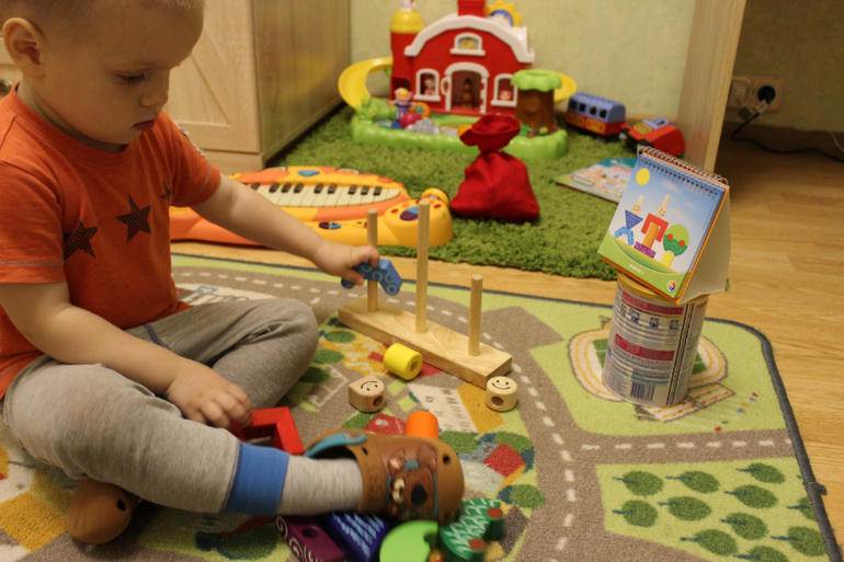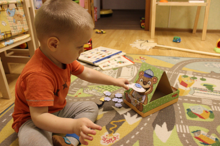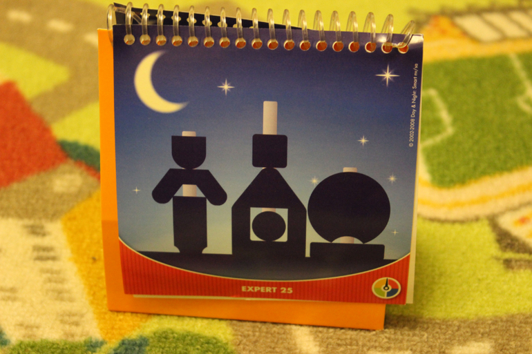 С самыми легкими заданиями "День" Костя вполне справляется. Изредка он может немного отвлечься или потеряться, конечно тогда я помогаю ему. А вот задания "Ночь" конечно ориентированы на деток постарше, ведь здесь уже нужно собирать пирамидку по силуэтам. Фото двух заданий для примера: