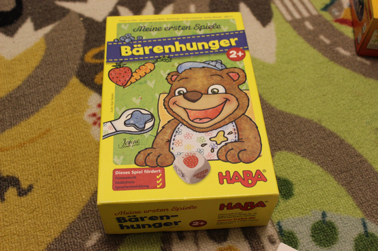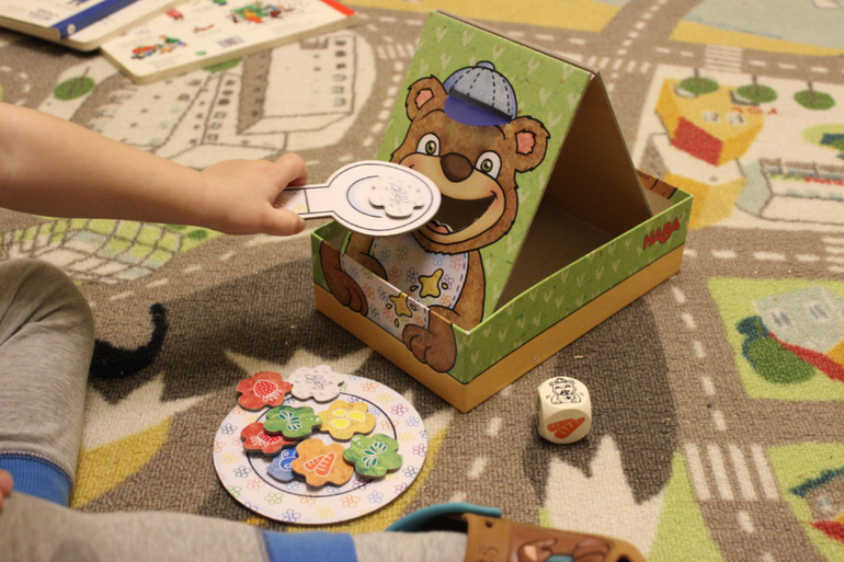 Начну с игр Haba. Наверное потому-что, я нежно их люблю за качество и оригинальность. Но буду краткой, ведь по ним я уже делала обзоры. Покажу снова "Голодного мишку", именно с него мы начинали играть в настольные игры. Хоть игра появилась у нас уже очень давно, а Костя до сих пор упрямиться играть в нее по правилам. Поэтому сын просто кормит Мишу различными яствами, а мама ненавязчиво сидит в сторонке и наблюдает)). Подробно об этой игре я рассказывала тут