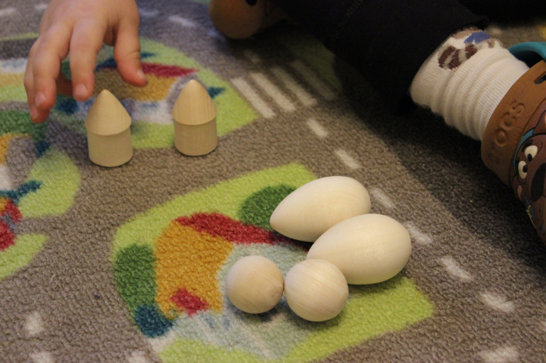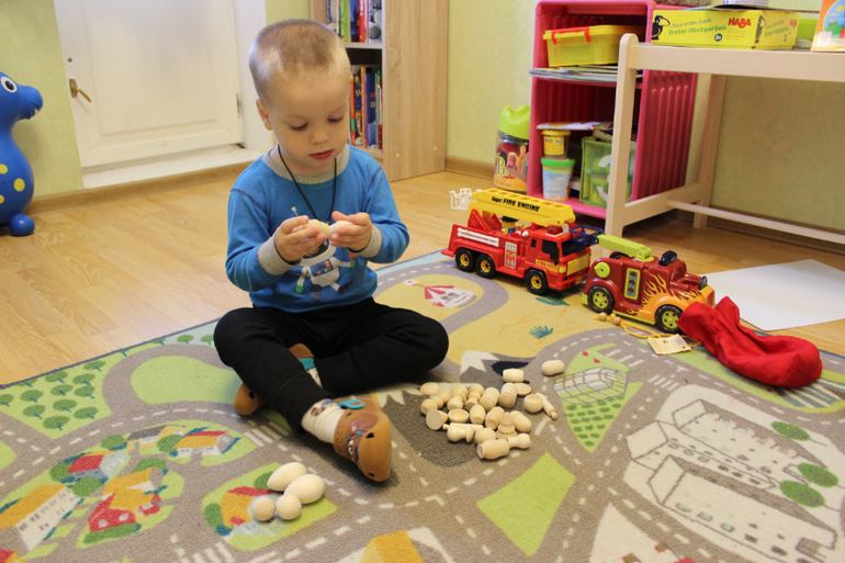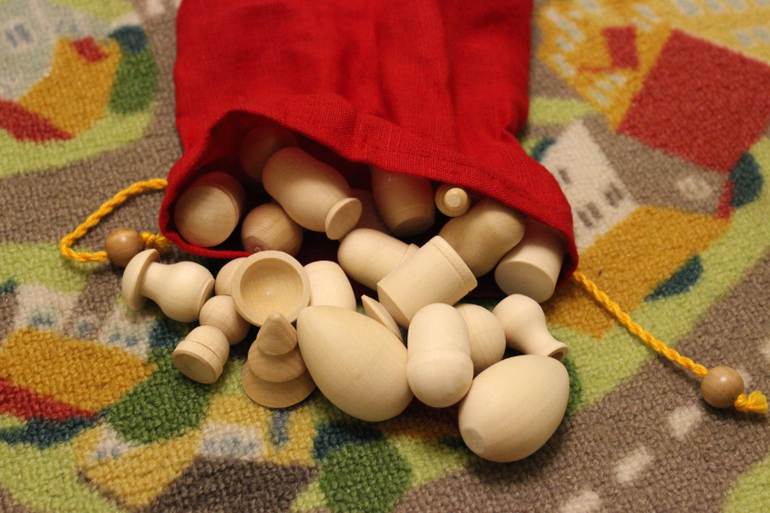До тактильного лото мы с Костей еще не доросли, а вот высыпать фигурки и искать пары нам очень нравится. Затем мы убираем все это богатство в мешочек. Меня больше всего радует, что фигурки не окрашенные и пахнут деревом. Очень приятно держать их в руках. Еще один несомненный плюс - каждую фигурку можно идентифицировать. Здесь есть скалки, яички, желуди, елочки, снеговики, матрешки, кувшинчики и т.д. Соответственно произнося названия фигурок - пополняем словарный запас)