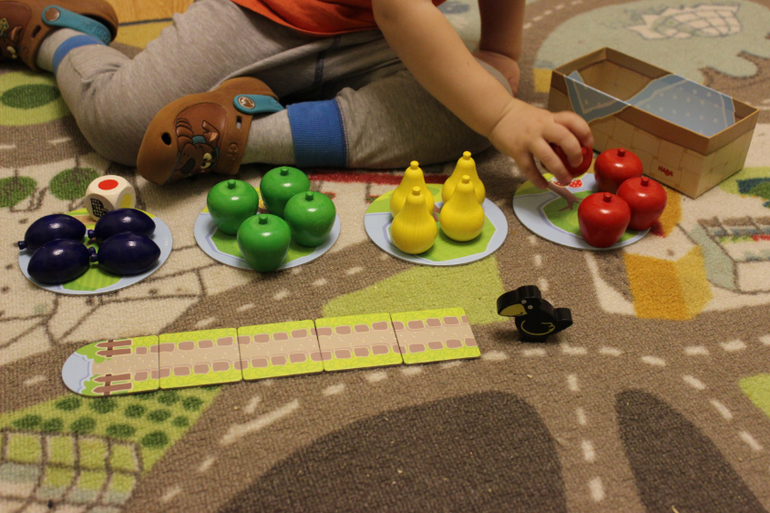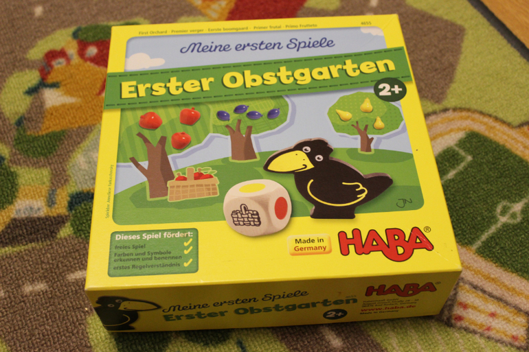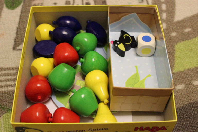 И продолжая тему Haba, конечно не могу не показать "Мой первый сад", дома мы ее называем "Фруктовый сад"). Подробный обзор с правилами есть тут. Вкратце о сути игры - нужно собрать все фрукты с деревьев быстрее, чем ворон придет в сад. Игра очень увлекательная, деток привлекают большие и яркие фрукты)