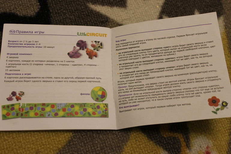 В коробочке - пазл-дорожка, кубик, фишки с изображением насекомых, 4 зверюшки, инструкция.