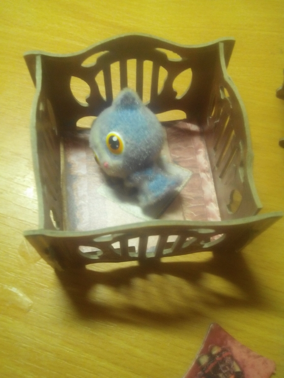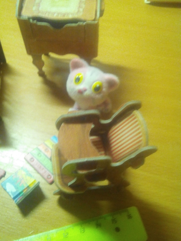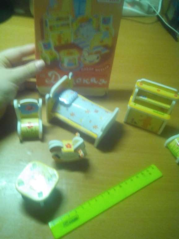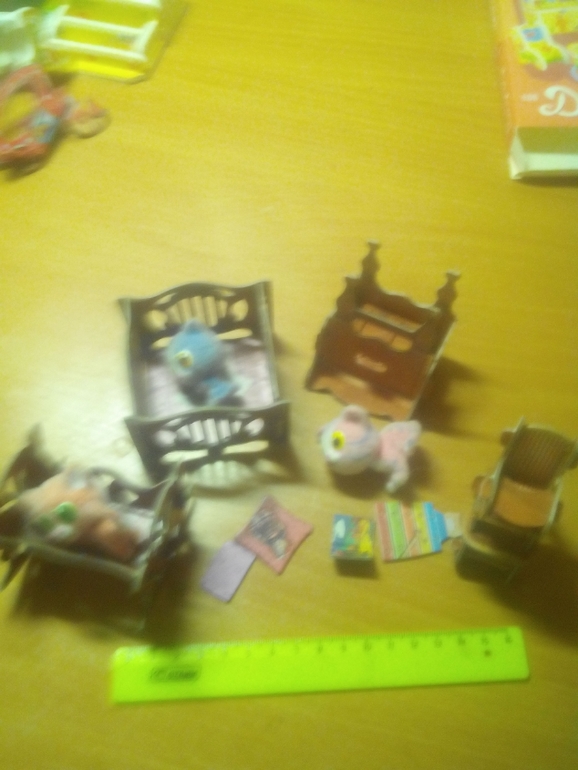 - детальки из плотного картона, в результате получилось пять предметов мебели. Весьма прочненькие могу вам сказать. Играть с ними очень даже возможно!Из деталей можно собрать кроватку, 2 стула, столик, лошадку-качалку и шкафчик. Длина кроватки около 9 см. А еще к ним прилагается маааленькая книжечка и картинка-журнал, и даже маленький медвежонок.