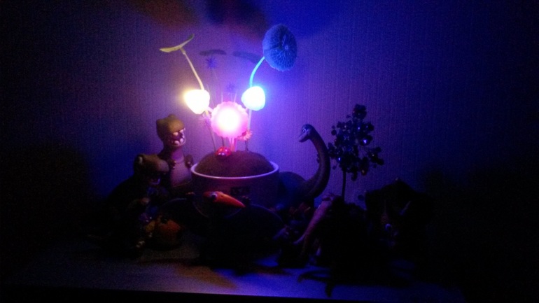 Особенность в том, что он реагирует на темноту. Чем темнее в комнате, тем ярче горит. Два грибка постоянным цветом, а один меняет: синий- красный- зеленый. Коля пытается угадать цвета, но пока у него плохо получается. Зато лежит глазеет и никуда не бежит! А Оля, глядя на него, тоже лежит, так и засыпает.