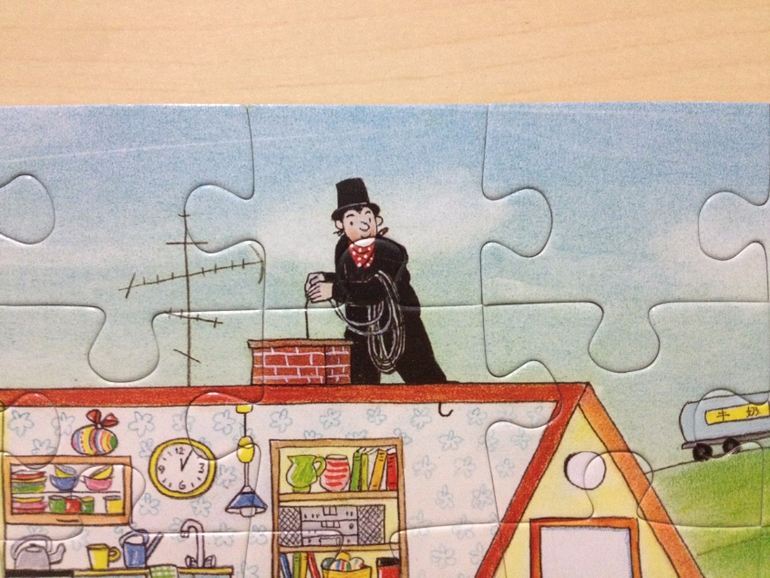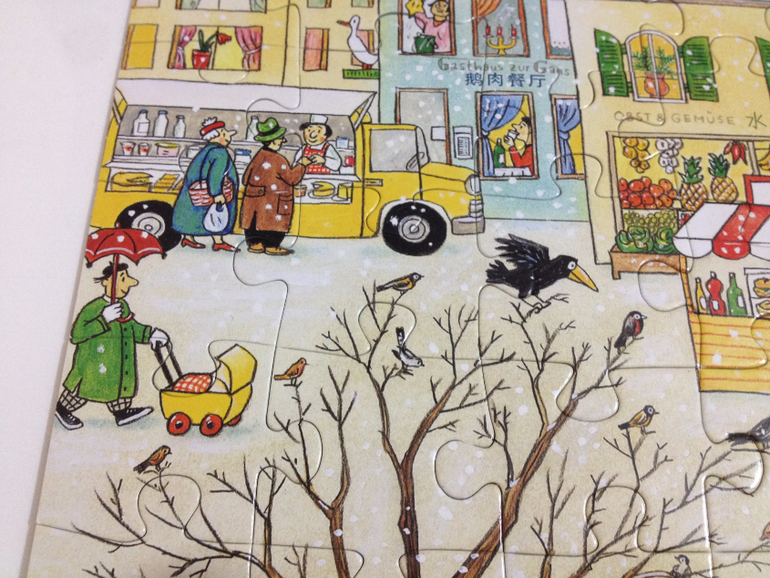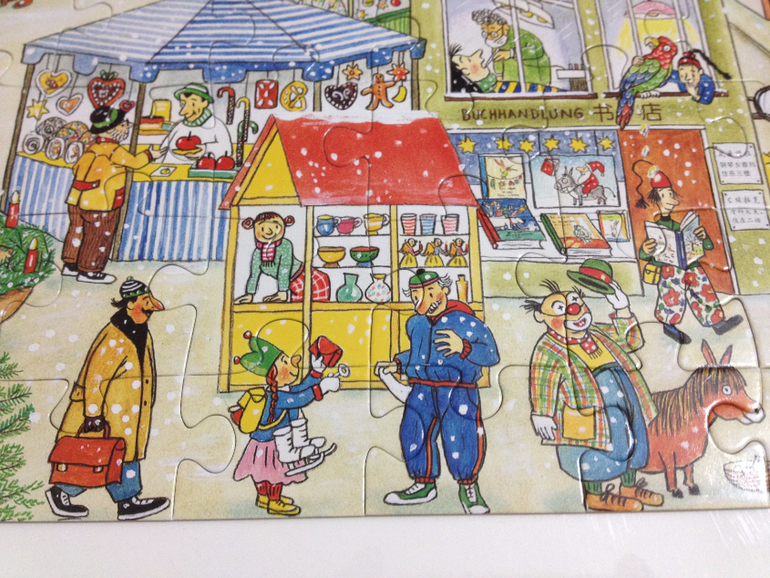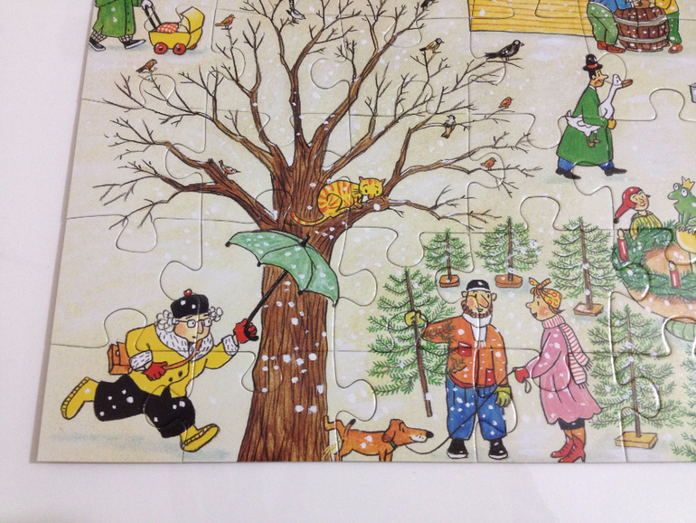 В синей зимней коробке, только один пазл в 100 деталей, безумно интересный, на коробке видно вот здесь.