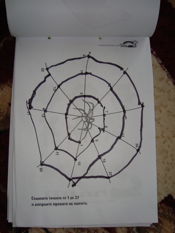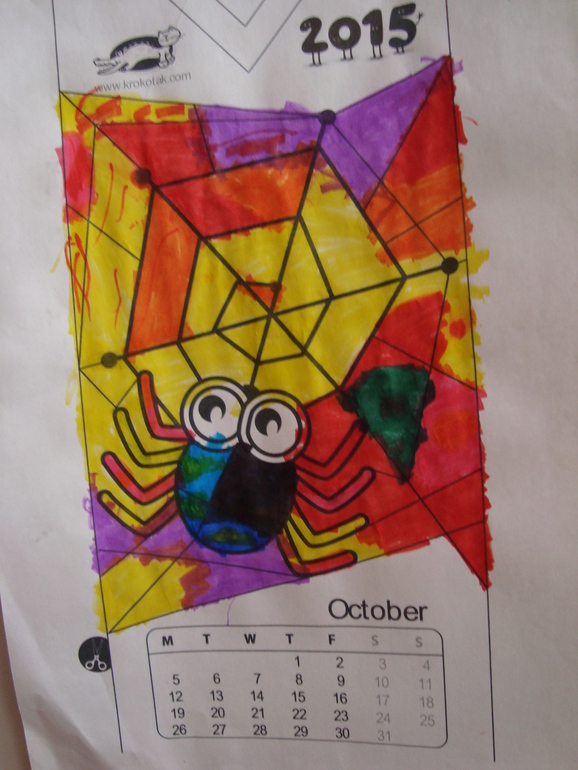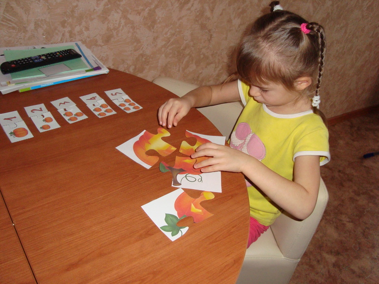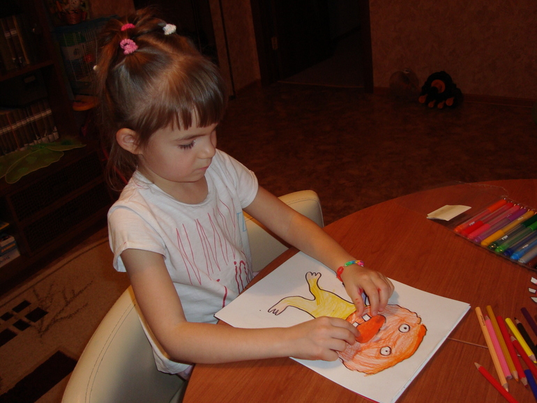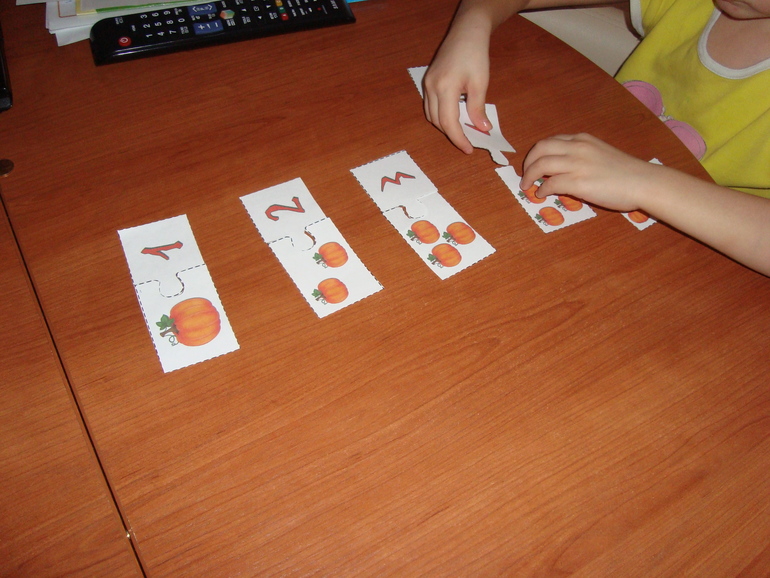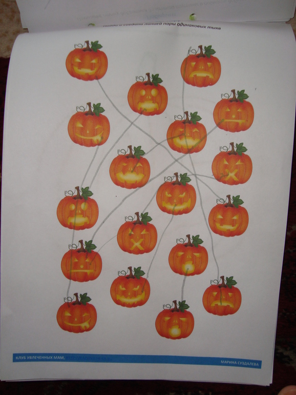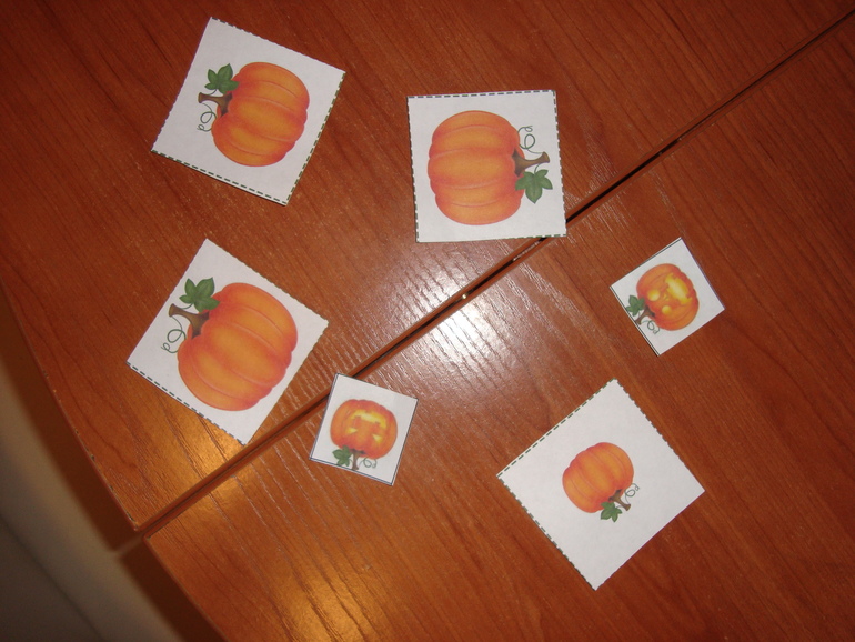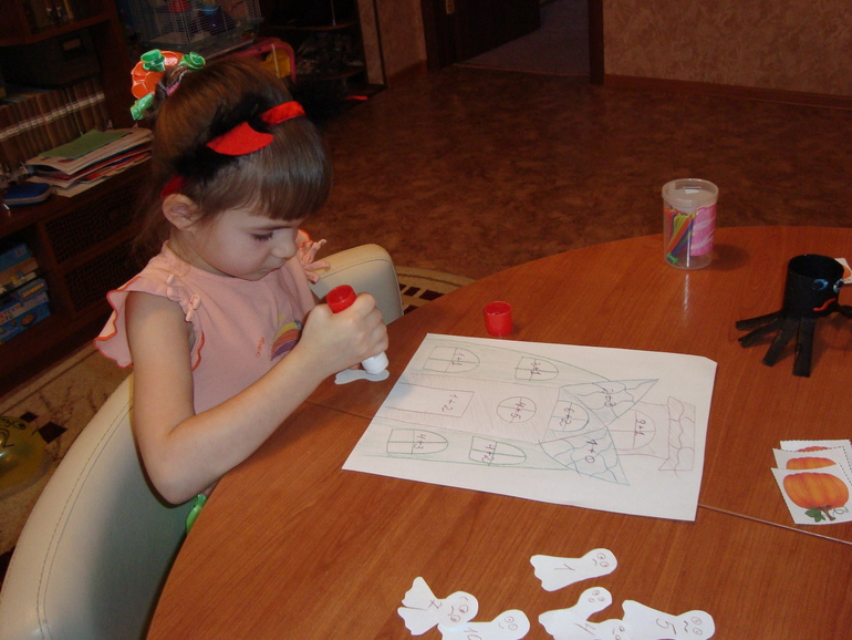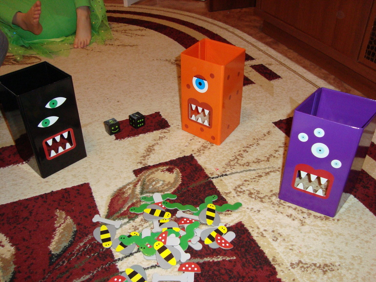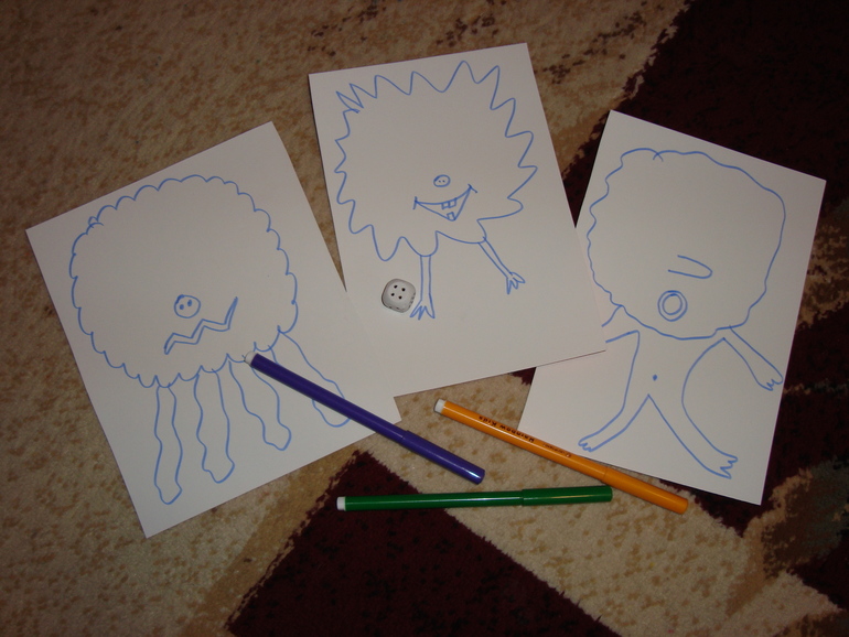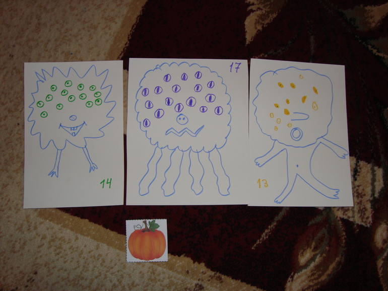 1 задание- Игра в Монстров. Кидаем кубик в 5 заходов, какая цифра выпала, столько глаз своему монстру рисуем. Победил папа и получил первую карточку с тыквой.