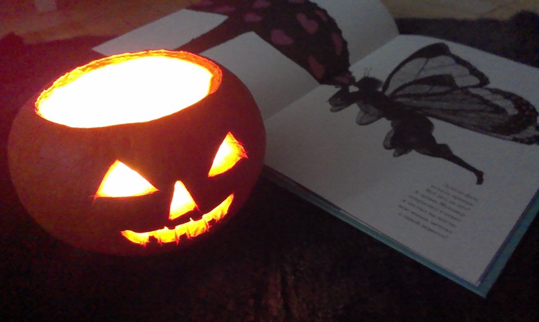 Сначала дети сели в кружок вокруг тыквы и послушали в моем исполнении некоторые страшные (на самом деле не очень) сказки из книги Фабиана Негри "Волшебные sms-сказки". В книге очень красивые черные и двухцветные иллюстрации, думала скопировать их и сделать теневой театр, но времени не хватило,слишком поздно я спохватилась делать праздник)