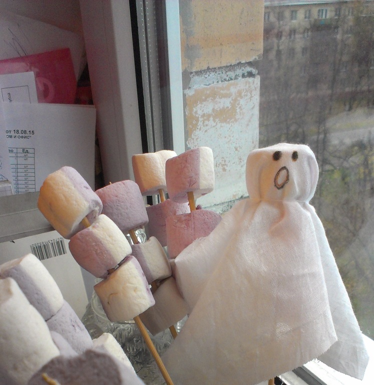 Такие вот "привидения" на палочке, популярное угощение. Ребенок принимал активное участие в изготовлении.