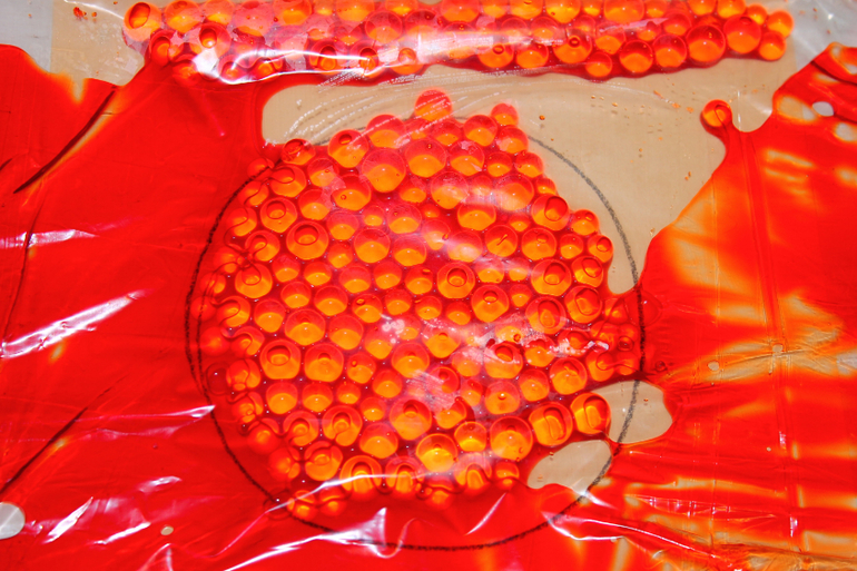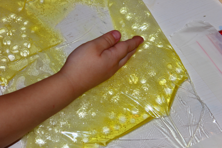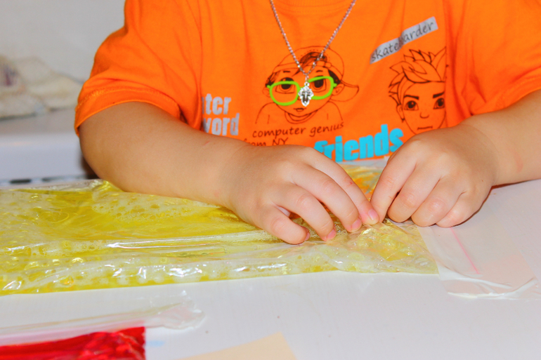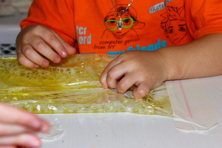 Или вот Тёма раскладывает яйца динозавров по гнездам. В роли гнезд нарисованные на пакете "корзинки" (не видно) , в роли яиц гидрогель (наполнитель- детский шампунь). Потом придумал раздавливать яйца плохих динозавров,а это оказалось непросто-раздивить шарик в пакете со скользким гелем.