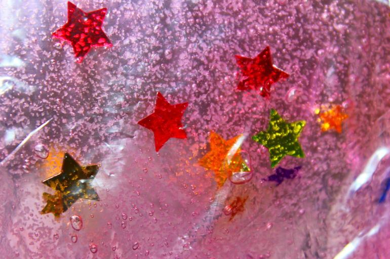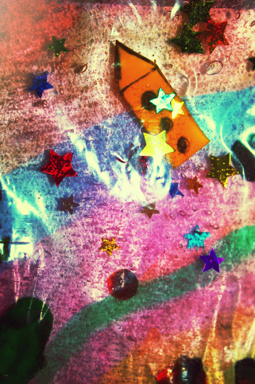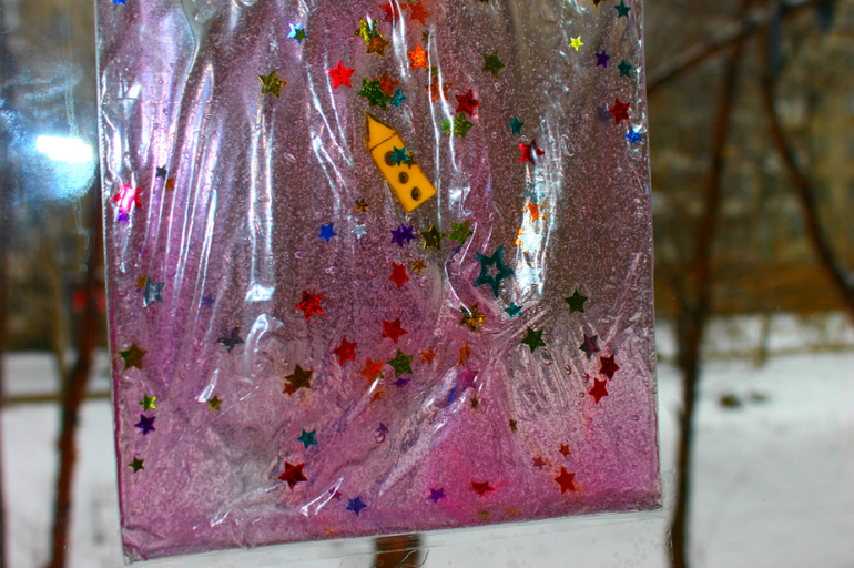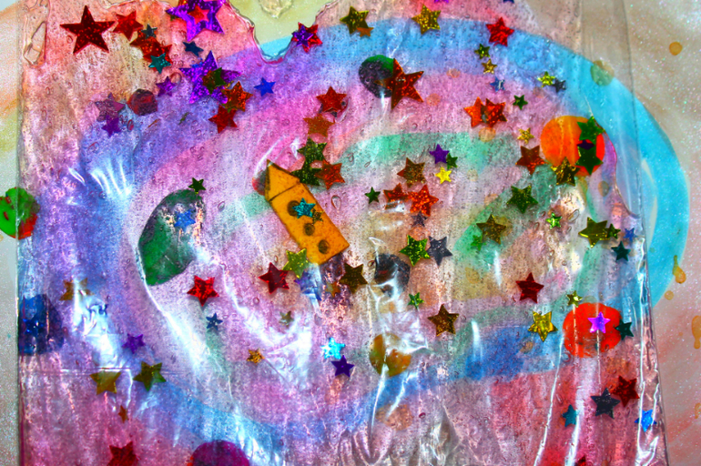 Пальчиками рисовать языки пламени на геле, которые оставляет ракета, рисовать траекторию движения.Наполнение- гель-скраб для тела, звездочки, ракета из пенки