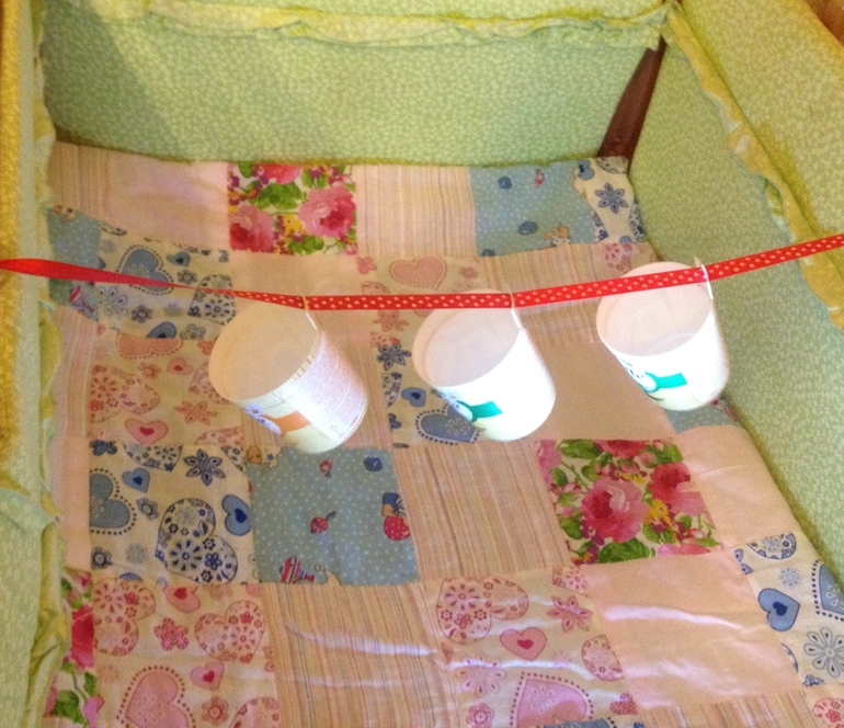 Когда малыш лежит в кроватке, ему скучно. Натяните резинку и повесьте на нее стаканчики от йогурта. Малыш будет хватать их ручками и играть.