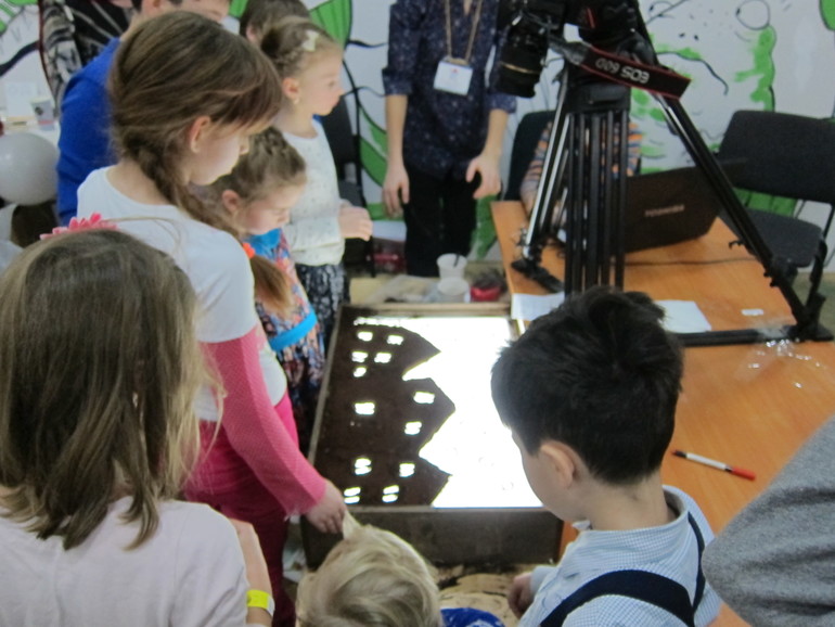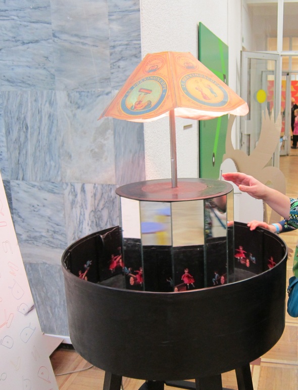 Были еще мультфильмы из Лего, мультфильмы, где снимались сами дети с нарисованными крупными предметами, мастер-класс по озвучке. В холле стояли разные приспособления, приведя в движение которые можно было оживить картинку. Вот такое например.