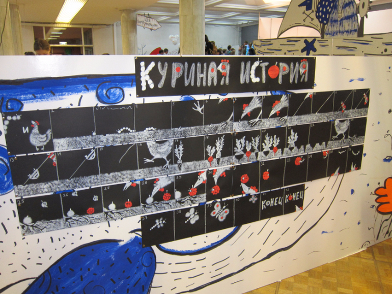 Манкой рисовали мультфильм "Куриная история". Вот так был разбит сюжет по снимкам. Мы появились где-то в середине мультфильма. Ребята нарисовали каких-то два или три снимка. Весь мультфильм можно будет посмотреть только на следующей неделе на сайте студии.
