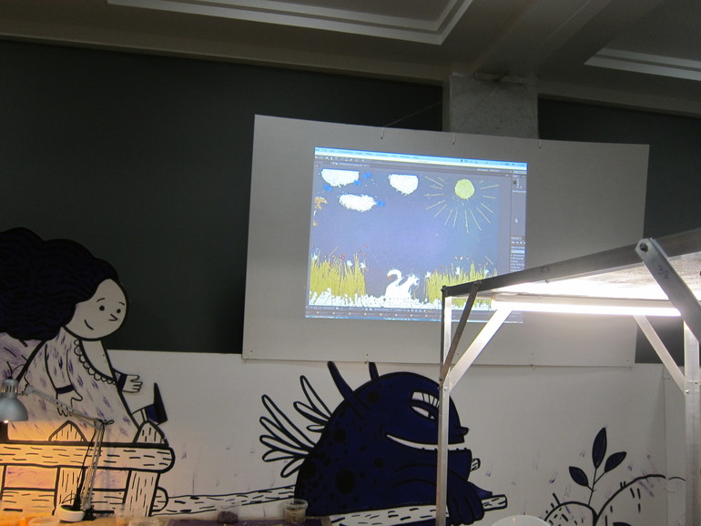 Для начала нам предложили просто потренироваться и порисовать на любую тему. Дети выбрали космос. Чего тут началось... Звезды, кометы, солнце, черная дыра, космический мусор... Рисовали, стирали кисточками, снова рисовали. Было весело и шумно.. Потом, когда дети перешли к созданию мультфильма на другом листе картона, родители заняли их места. Рисовать на манке - это оказывается такое медитативное занятие. Дома надо обязательно повторить.