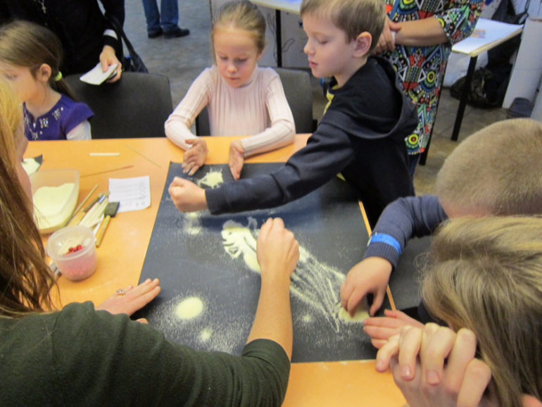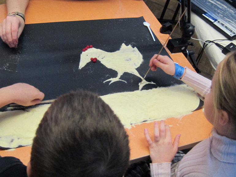 Вторым пунктом была Вилла Курица. Здесь мультфильм создавался на черном картоне с помощью манки. Давно мы не играли с манкой, а это такое удовольствие))