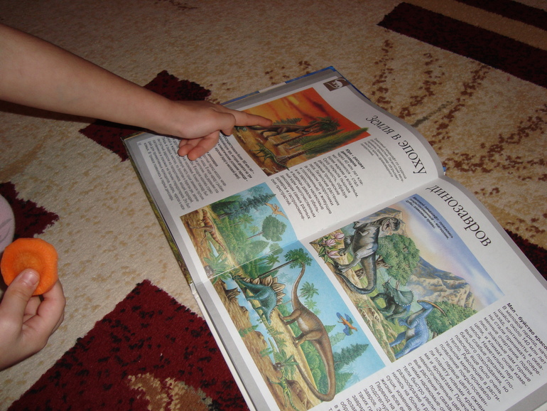 Читали нашу энциклопедию про динозавров, вспоминали названия и отличительные особенности.