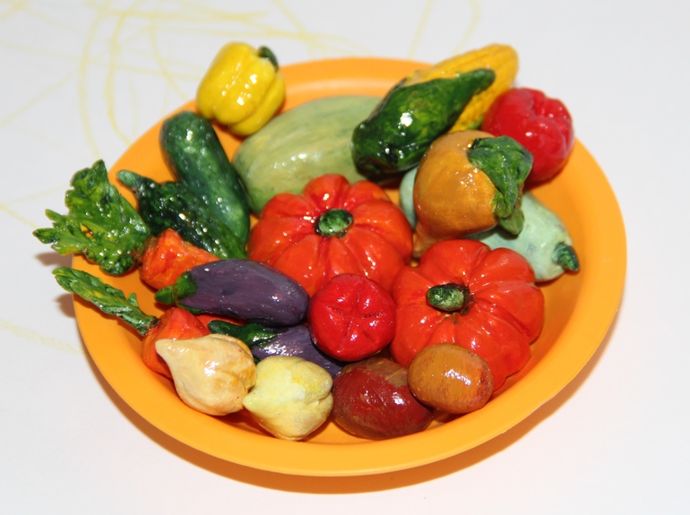 В общем слепила - отщипывала немного и остаток убирала в целлофановый мешочек, чтобы не засохла. Сутки посохли, потом расписывала акриловыми красками. Несколько листиков отвалилось от яблок, расписала тоже не без огрехов. Зато живописненько получилось))) В конце уже покрывала глянцевым лаком для декупажа на водной основе.