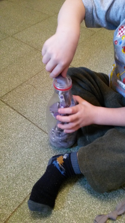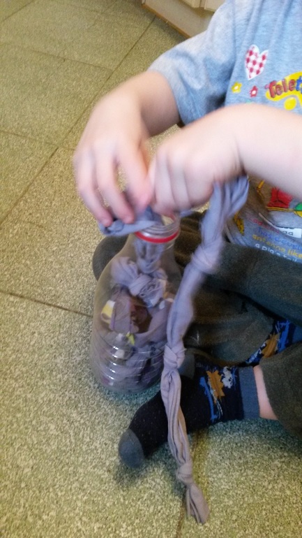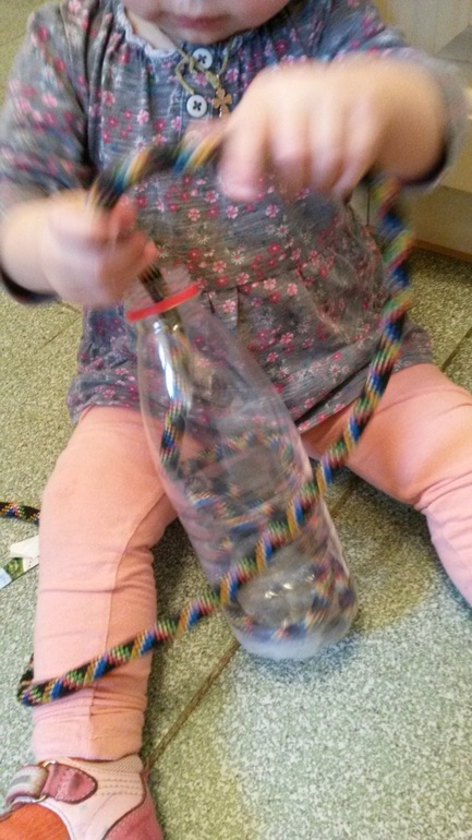 Коля увидел, спросил: " это что?" . Дала ему пластиковую бутылку от молока и сказала, чтобы попробовал засунуть туда эти шнурки. Он с радостью схватил, ловко все запихнул, вытащил, еще раз запихнул и убежал к себе в комнату, уселся на свою кроватку и возился уже там, закусив язык. Вообще- то делала для Оли, не думала, что он тоже заинтересуется.