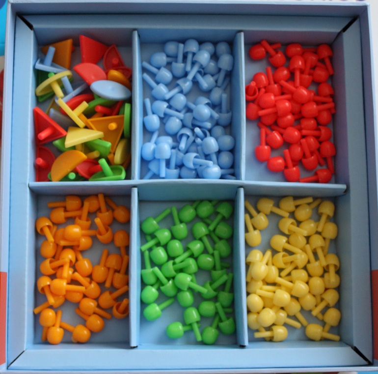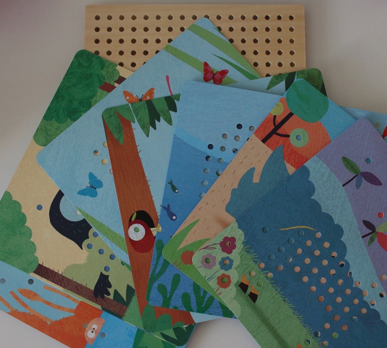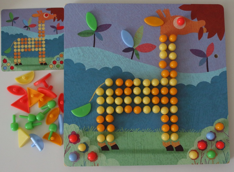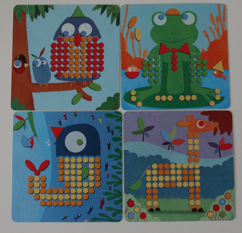В комплекте: деревянный планшет, 8 трафаретов для мозаики, 4 двухсторонние карточки с образцами сборки и много "гвоздиков") Что самое интересное в данной мозаике, в комплект входят не только "гвоздики", но и фигурные детальки.