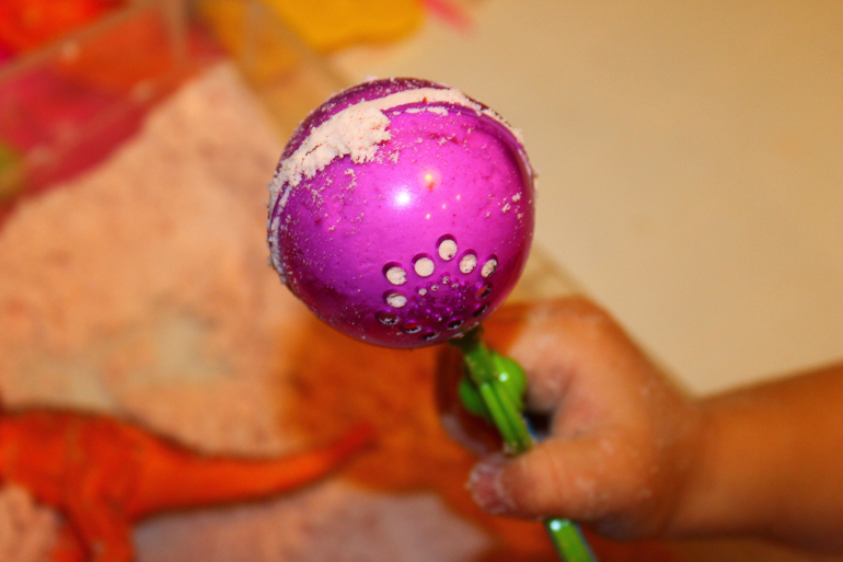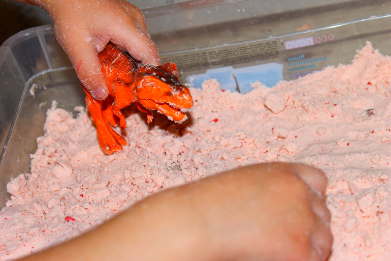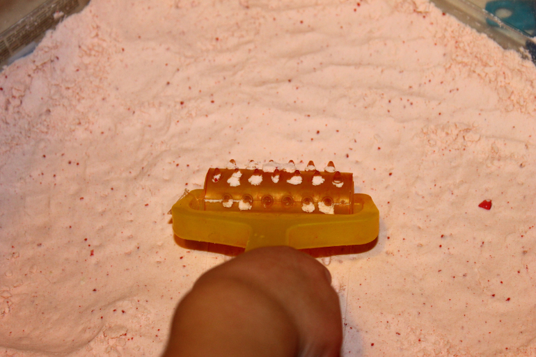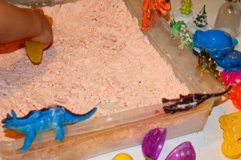 Точные пропорции не скажу, наверное грамм 200 муки и чуть больше половины бутылочки масла (бутылка 200 мл). Чтобы сделать такой "песочек" цветным натерла два больший мелка на средней терке. В итоге у нас получилась нежнейшая субстанция, лепить можно,прекрасно держит форму,аромат замечательный,то небольшое количество,которое остается на руках после игры смывается водой легче легкого.