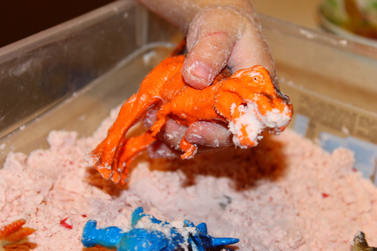 Началось,кстати говоря со сказки про динозавров. Подобрала я два диносемества, одно состояло из маленьких фигурок динозавров, второе из больших.