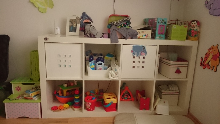 Здесь еще во время беременности я показывала детскую нашей маышки. Игрушки в том выдвижном ящике в шкафу уже почти не помещаются да и оказалось не совсем удобно постоянно туда залезать. Хочу новую систему хранения и у меня появилось несколько идей.