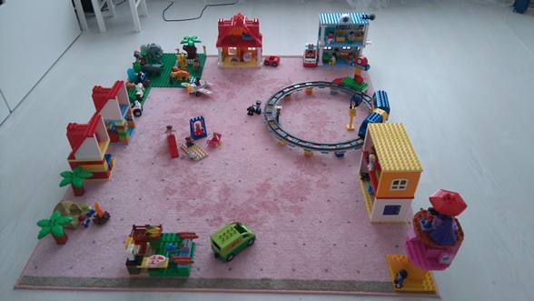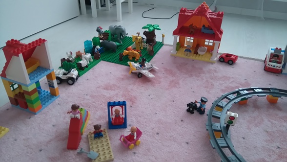 У нас тут больница, зоопарк обычный и зоопарк с домашними животными, железная дорога, два больших дома и два маленьких (бюджетные, из остатков), детская площадка с горкой, магазин продуктов, башня с заточенной принцессой, палатка походная с костром среди деревьев и всё это патрулирует полицейский с собакой.