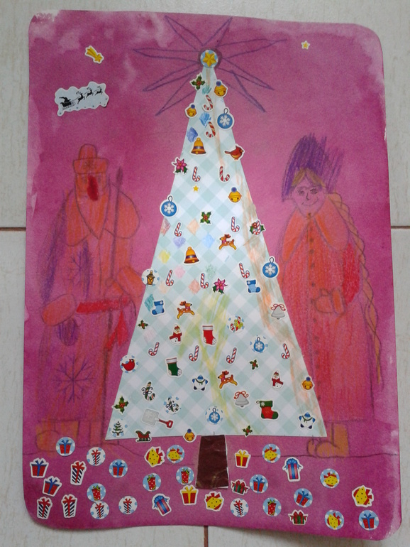 Звезду и новогодних героев рисовал папа, я как увидела - онемела. Вот такое разное видение: у нас звездочки, Дедушка летит на санях и оставляет под ёлкой подарки, а у папы Дед с красным носом и горбатая Снегурка. И смех и слёзы.