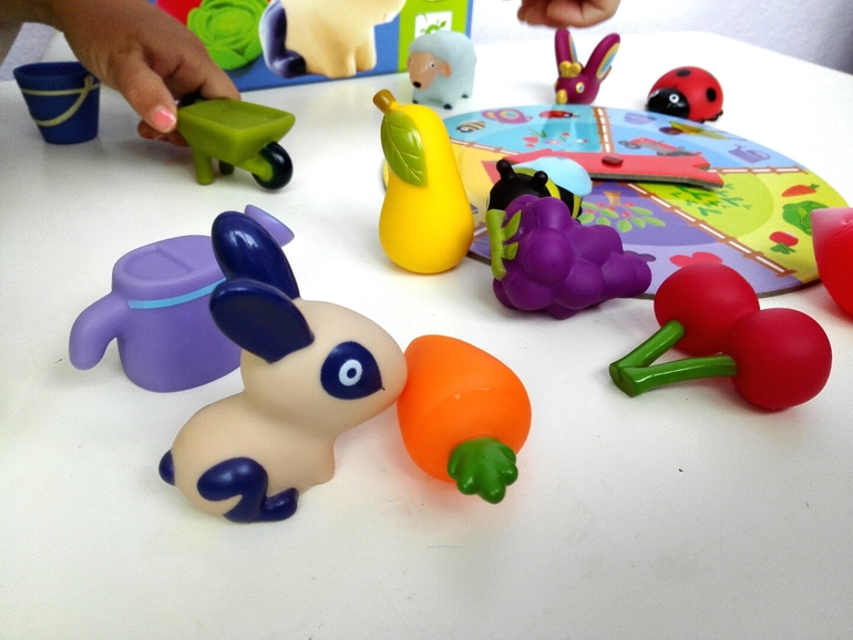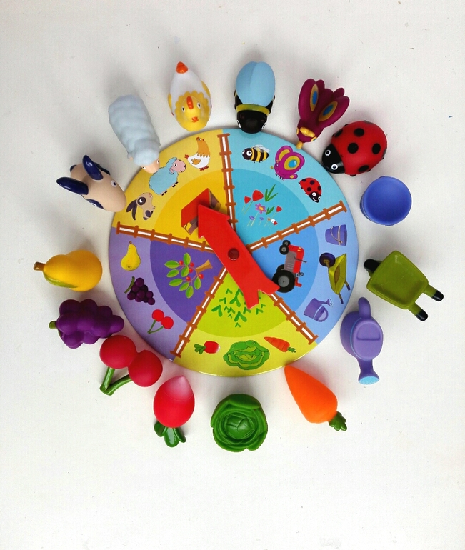 В комплект входит: игровое поле-рулетка, разделенное на 6 секторов - овощи, фрукты, животные фермы, насекомые, инвентарь, 15 фигурок.