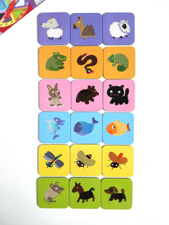 Как ирать: все карточки с животными лежат в мешочке. Самый младший игрок крутит стрелку. Она останавливается на материале. (Если стрелка остановилась между двумя секторами, игрок снова запускает рулетку.) Затем он запускает руку в мешочек, чтобы найти на ощупь карточку, материал которой выпал на рулетке.