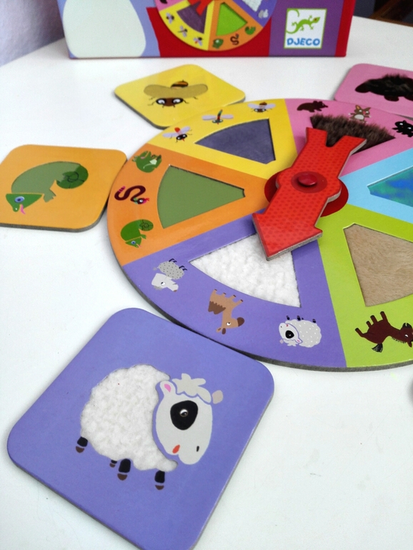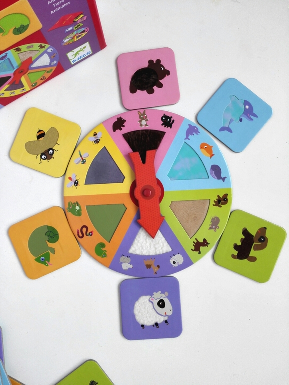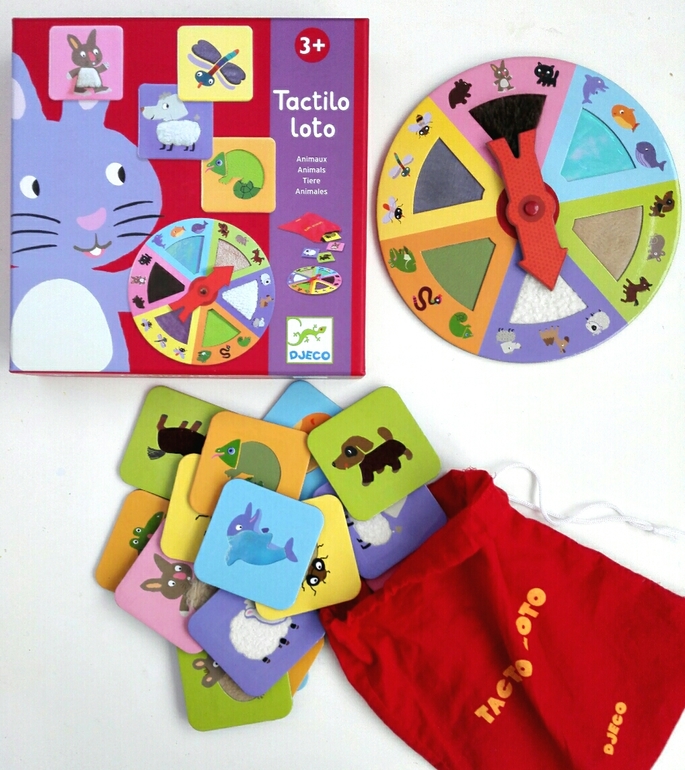Как играть: по очереди дети крутят стрелку на барабане, в зависимости от выпавшего сектора и рисунка, они пытаются найти в мешочке на ощупь соответствующий предмет. Ох как это не легко и весело! А игрушки, как всегда у Djeco, очень очень приятные на ощупь, ими можно и просто играть в сюжетные игры!