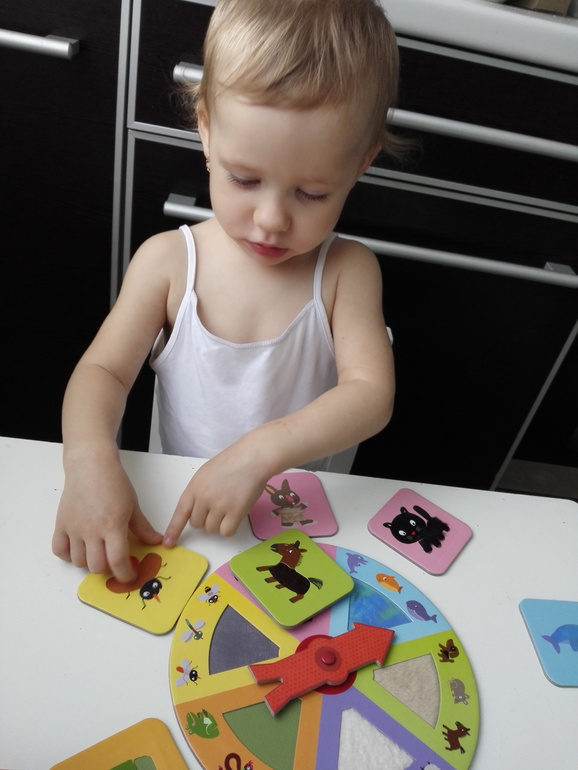 Появилось это лото у Даши в 2,5 года, так мы сначала просто раскладывали по секторам, а потом доставала 2 карточки из мешочка и необходимо было из них выбрать нужную, потом добавилась и третья, потом когда карточек стало 5 мы их в мешочек положили, а сейчас конечно среди всех выбираем)