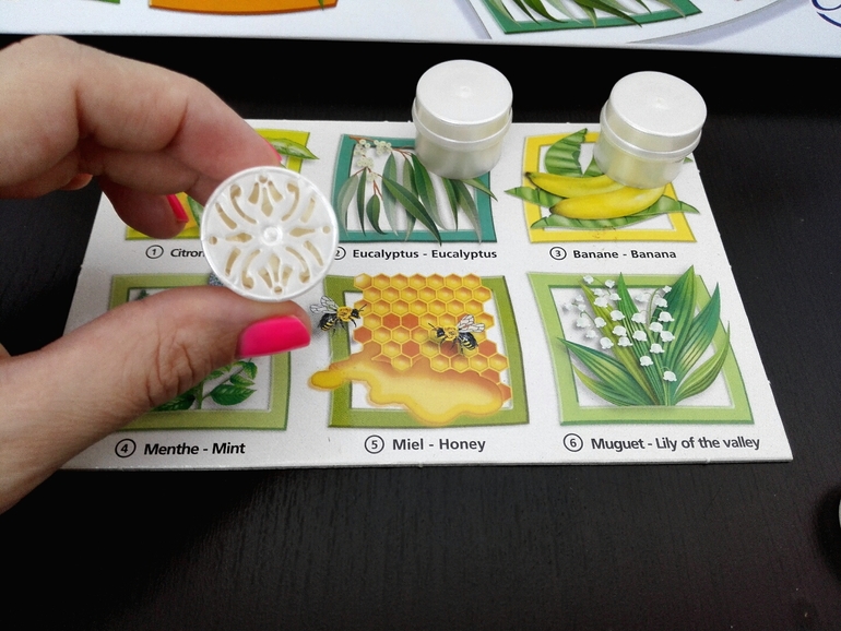 Игра включает 30 баночек с ароматами ( роза, мыло, апельсин, трава, ананас, море, черная смородина, мёд, эвкалипт, клубника, костер, яблоко, апельсиновый цветок, грибы, грейпфрут, банан, дыня, лаванда, ваниль, ландыш, печенье, фиалка, лимон, сосна, кокос, фенхель, орех, мята, жимолость, абрикос) и 5 карт полей.